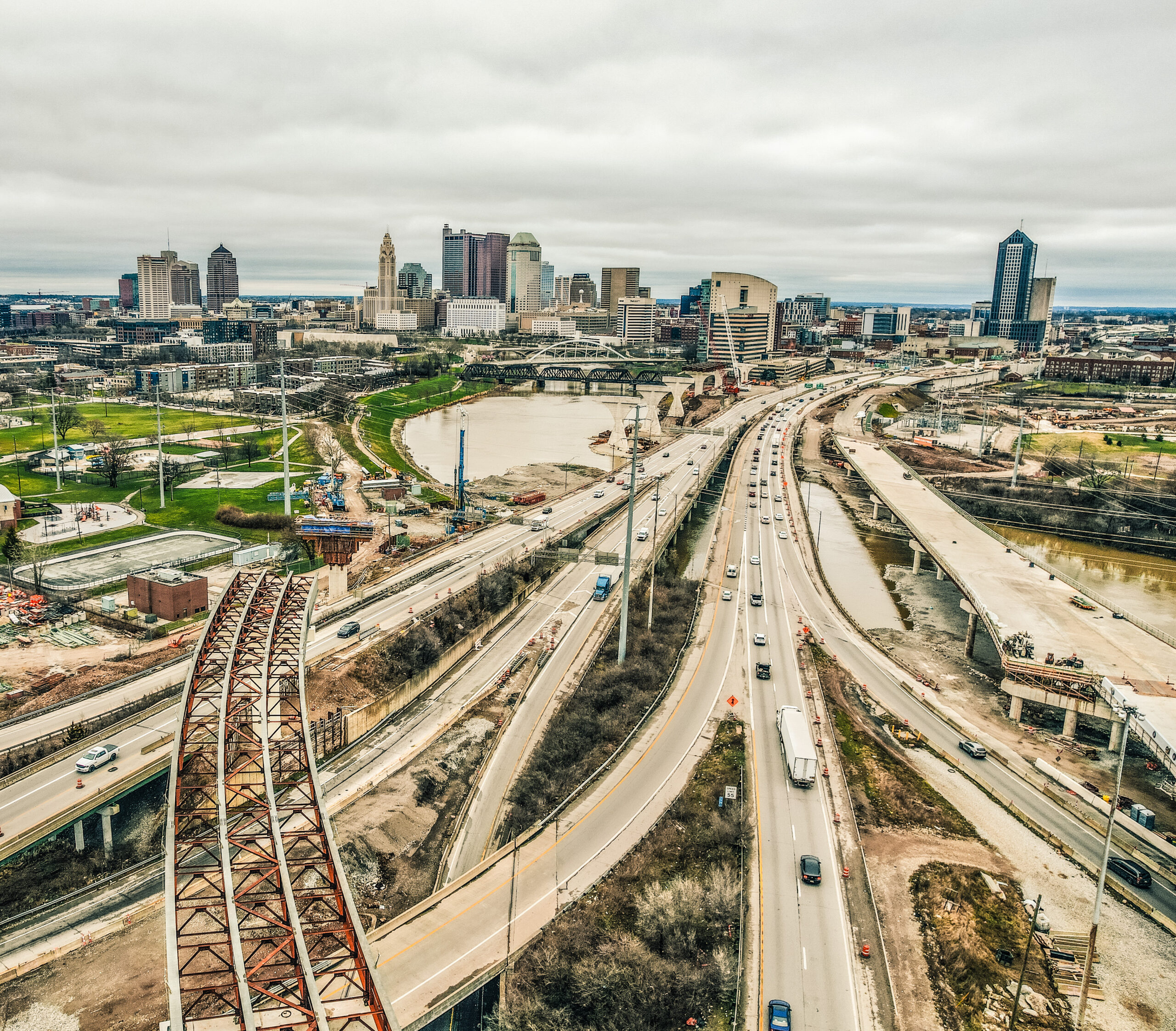 True Inspection Services is providing project engineering and construction inspection services on this major roadway rehabilitation and widening project. This project is part of a series of projects to reconstruct Interstates 70/71 in downtown Columbus, Ohio. When complete, the projects will result in new urban avenues with complete streets, enhanced freeway crossings with safe pedestrian and bicyclist accommodations, and the removal of outdated ramps. Project work items include reconstruction of portions of I-70 east and west, I-71 north, reconstruction of I-70 from SR 315 to Grant Avenue, including bridges over the Scioto River, SR315, NFS and CSX railroads, reconstruction of 3rd, 4th and High Street bridges, along with the construction of seven retaining walls. The total construction cost is estimated at $343 million, started in Spring of 2024 and is slated to be completed by Summer of 2031.